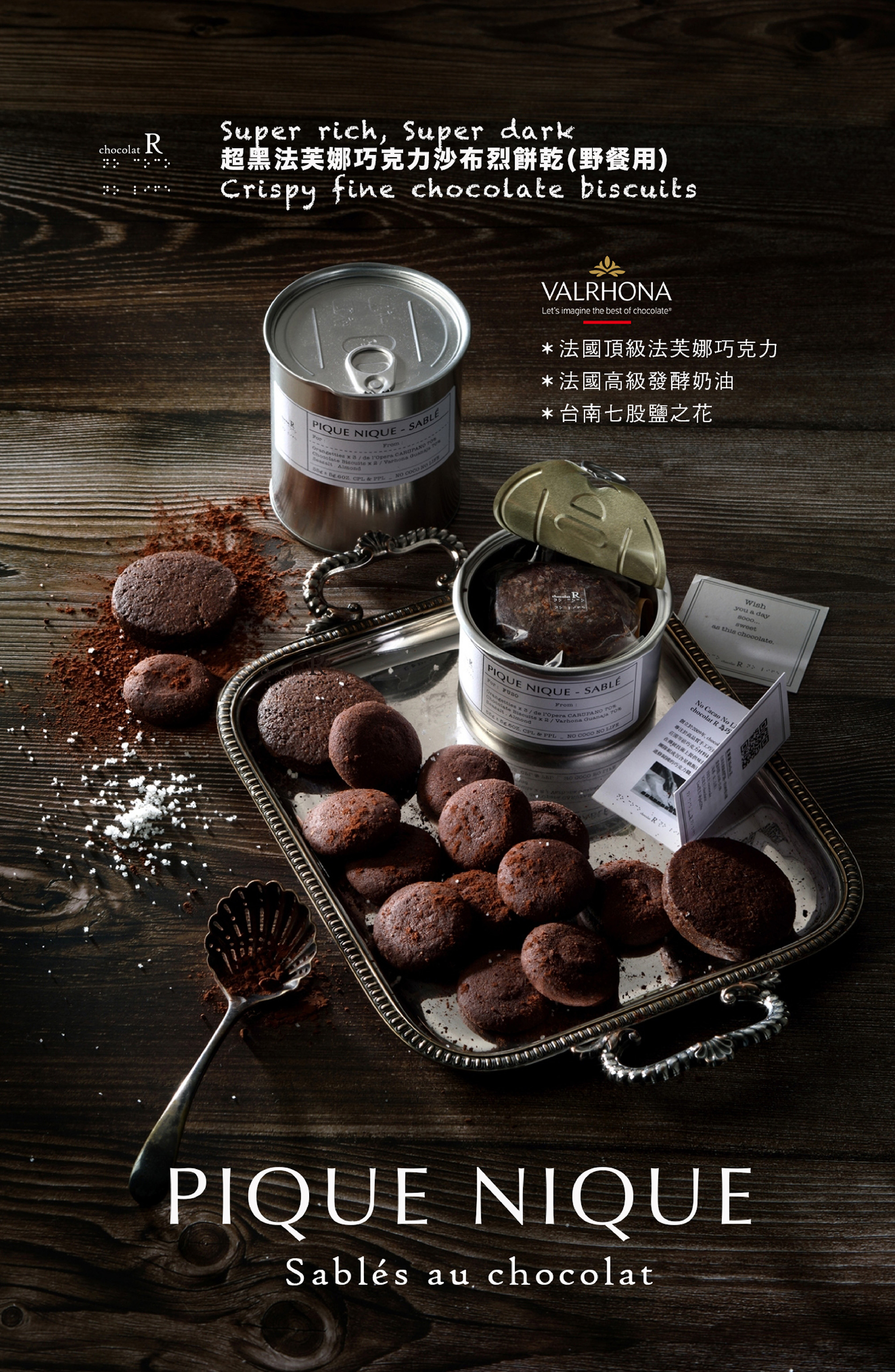 × 由創業16年的專業巧克力品牌 chocolat R 職人工作室監製,嚴選法國頂級 法芙娜可可 與發酵奶油製成,酥脆濃郁,層次細緻。每一口都能感受到頂級巧克力的醇厚風味,專為兩人份的優雅野餐時光所設計。